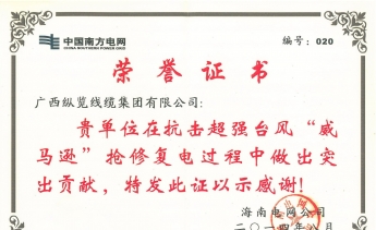 全國電線電纜產(chǎn)品質(zhì)量監(jiān)管AA級企業(yè),全國重合同守信用單位,廣西“二十五”電線電纜產(chǎn)業(yè)重點(diǎn)扶持企業(yè),國家強(qiáng)制性產(chǎn)品CCC認(rèn)證